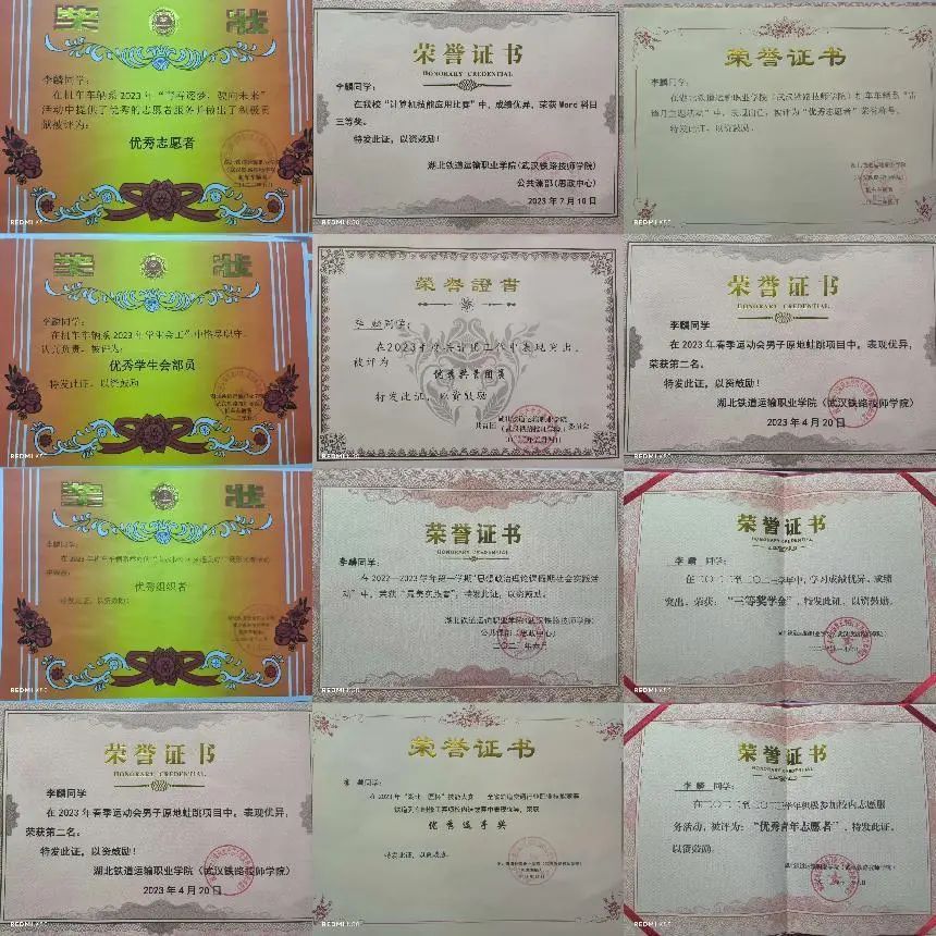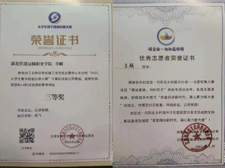 2023学年度荣获得国家励志奖学金、三等奖学金、优秀共青团员、优秀学生会部员、优秀志愿者。““穿越孤独,向阳花开”活动中荣获“优秀志愿者荣誉证书”;大学生数字技能应用大赛计算机技能应用赛道荣获“Word科目全国初赛专科组“三等奖”;春季校运动会男子原地蛙跳项目中荣获第二名;思想政治理论课假期社会实践活动中荣获“最美实践者荣誉证”;计算机技能应用比赛中荣获Word科目“三等奖”。