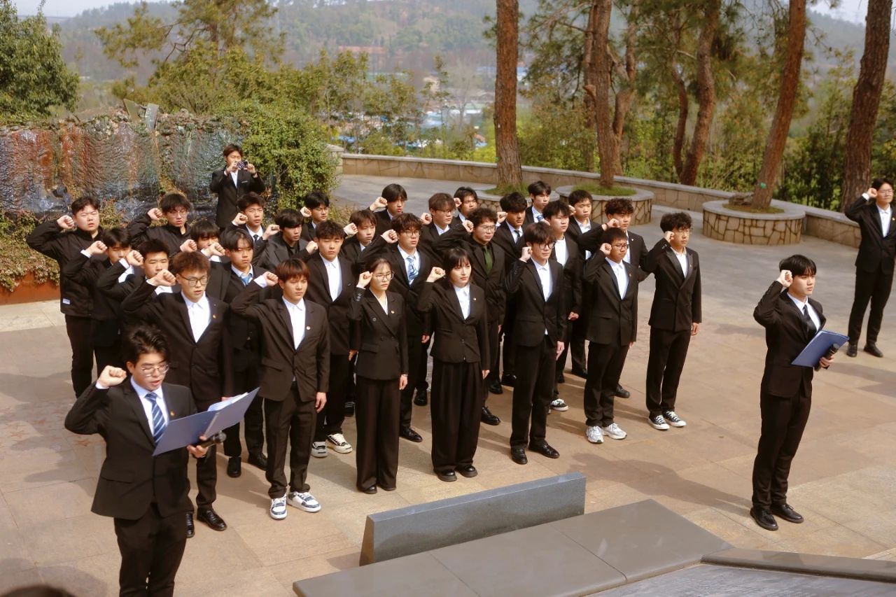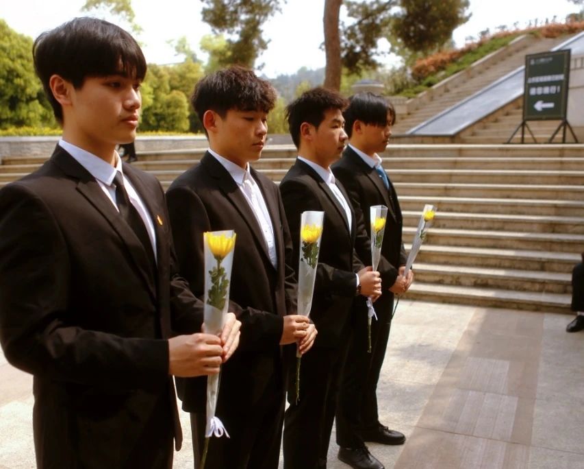 "我志愿继承先烈遗志,以青春之我建设青春之中国!"全体师生面向纪念碑庄严宣誓,铿锵誓言回荡陵园。辅导员老师在总结中强调:"陈怀民烈士用生命诠释了家国大义,我们要将这份精神转化为职业担当,在民族复兴征程中续写荣光。"仪式最后,师生依次向烈士墓敬献黄白菊花,春风拂过墓碑,仿佛英烈精神正化作青年逐梦的动力。