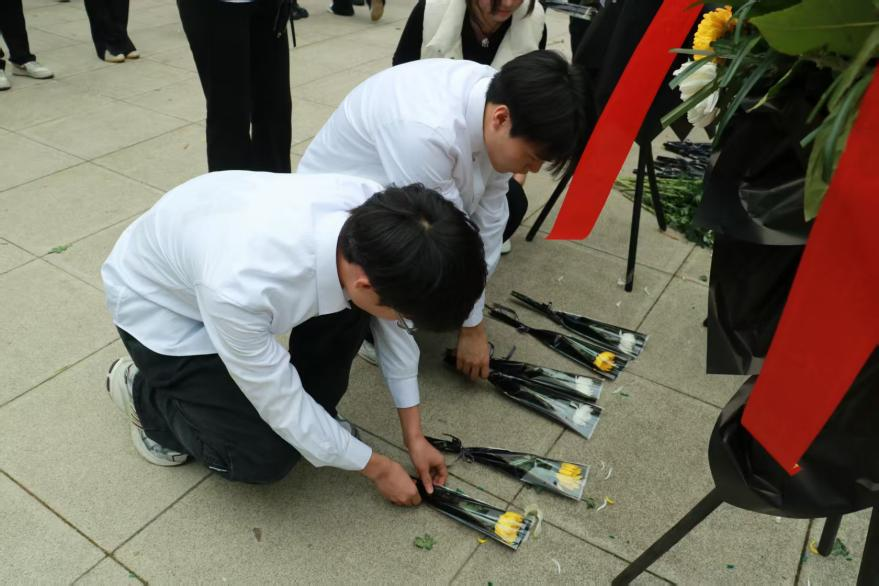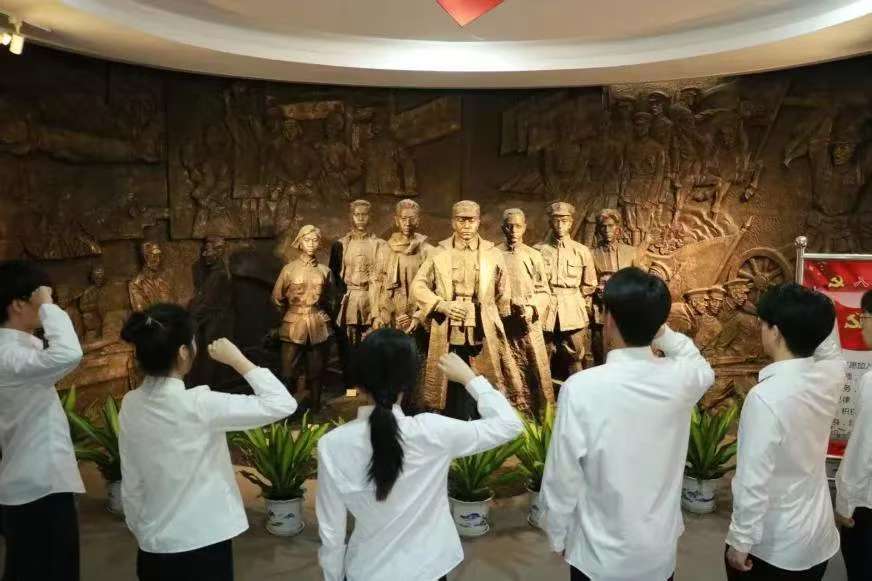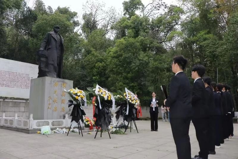 活动首站走进江夏革命烈士纪念馆。馆内大量历史照片、珍贵文物及场景复原,生动展现了革命时期江夏地区的斗争历程。党员老师吕晓泓现场开展微党课,带领学生深情回顾项英等革命先辈的英雄事迹,深刻感悟“敢为人先、百折不挠”的革命精神。在庄严肃穆的烈士雕像前,团员青年们重温入团誓词,以铿锵誓言告慰英烈忠魂。全体成员向革命先烈敬献鲜花,齐唱国歌,用深情礼赞表达无限敬仰。